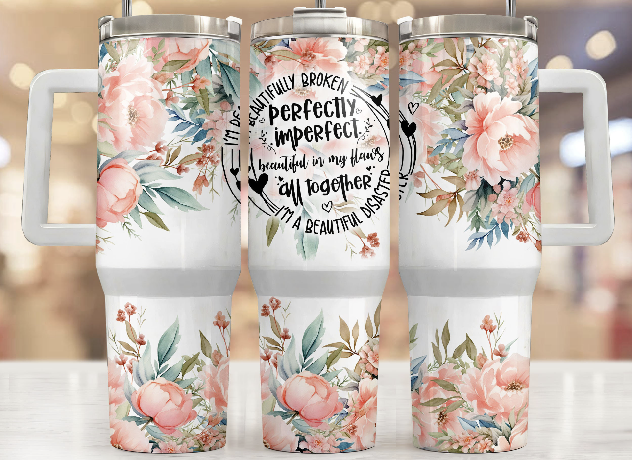 Empowering Inscription: The tumbler boldly displays the empowering message: "I'm Beautifully Broken, I'm a Beautiful Disaster, Perfectly Imperfect beautiful in my flaws all together." It serves as a reminder to embrace your flaws, as they make you beautifully unique.