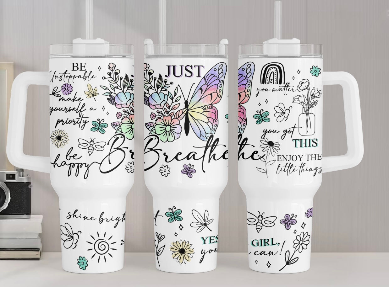 Inspirational Butterfly Design: The tumbler is adorned with a beautiful butterfly and the affirming message "Just Breathe." It serves as a reminder to pause, take a moment, and find peace amidst the hustle and bustle of life.
