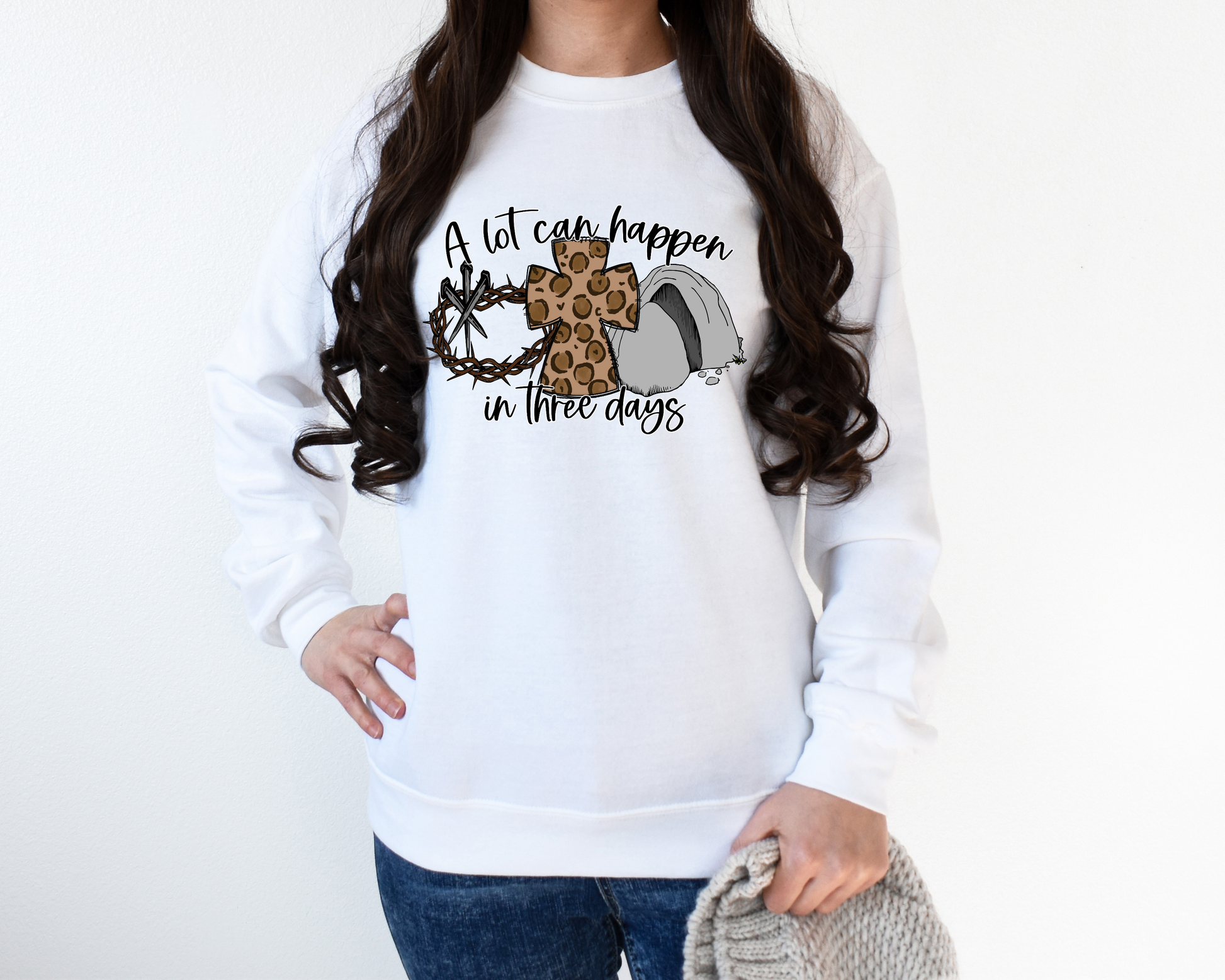 A Lot Can Happen In 3 Days. Pictured is on a White sweatshirt.