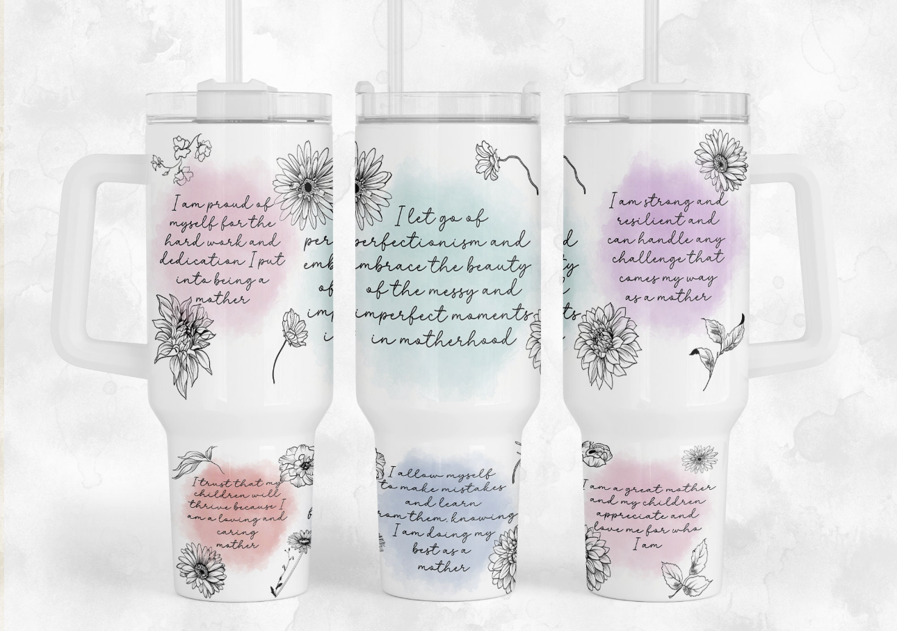 Introducing our 40 oz Stainless Steel Tumbler - the "Floral Affirmation" Tumbler. This tumbler is not only a durable and dependable choice for your beverages but also a source of positivity and inspiration.